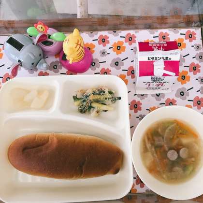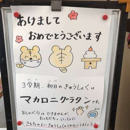 1/12、3学期はじめの給食は「マカロニグラタン、ウインナーのスープ、和なし(カット缶)、黒糖パン、牛乳」でした。