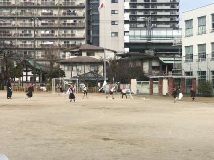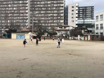 はじめは、糸が絡まないように糸を短くして、たこをあげる練習をしました。