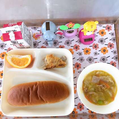 2/2の給食は「おし麦のグラタン、スープ、いよかん、黒糖パン、牛乳」でした。