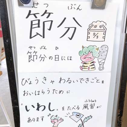2/3の給食は【節分の行事こんだて】で「いわしのしょうがじょうゆかけ、ふくめに、いり大豆、ごはん、牛乳」でした。