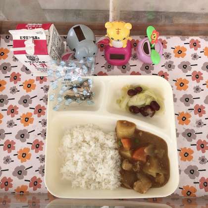 3/14の給食は「チキンカレーライス、ビーンズサラダ、アーモンドフィッシュ、牛乳」でした。