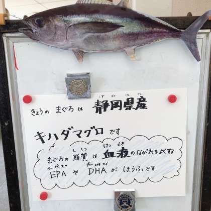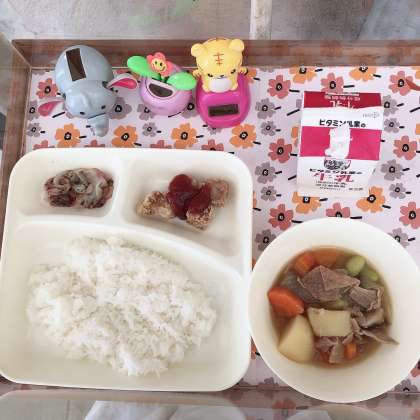 4/18の給食は「まぐろのオーロラに、ぶた肉と野菜のにもの、キャベツの赤じそあえ、ごはん、牛乳」でした。