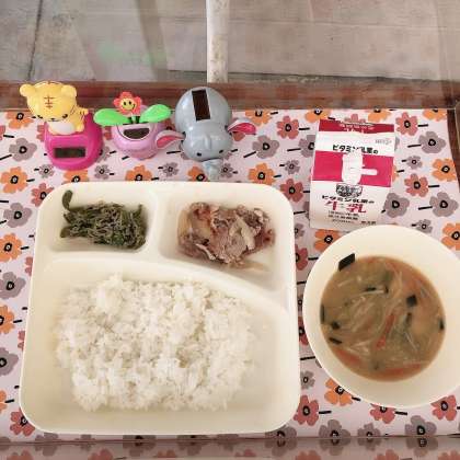 4/19の給食は「ぶた肉のしょうがやき、みそしる、じゃこピーマン、ごはん、牛乳」でした。