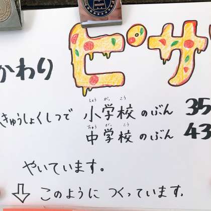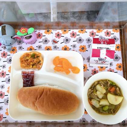 5/9の給食は「ぶた肉と野菜のカレースープ煮、変わりピザ、みかん(かん)、牛乳」でした。