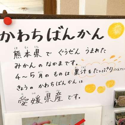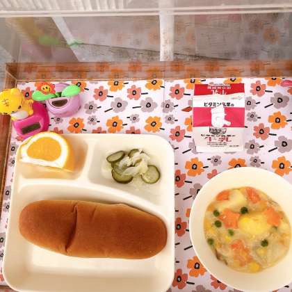 5/11の給食は「コーンクリームシチュー、キャベツときゅうりのサラダ、かわちばんかん、黒糖パン、牛乳」でした。