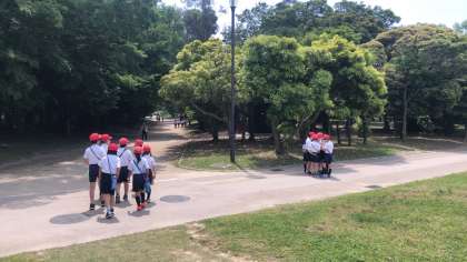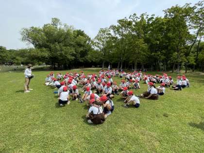 三、四年生。植物園にてオリエンテーリングが始まりました。「仲良く、楽しく、安全に」を合言葉に園内を三、四年合同の班でまわります。
