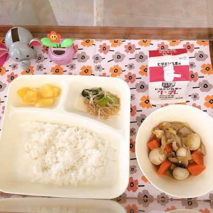 5/19の給食は「八宝菜、チンゲンサイともやしのしょうがあえ、パインアップル(カット缶)、ごはん、牛乳」でした。
