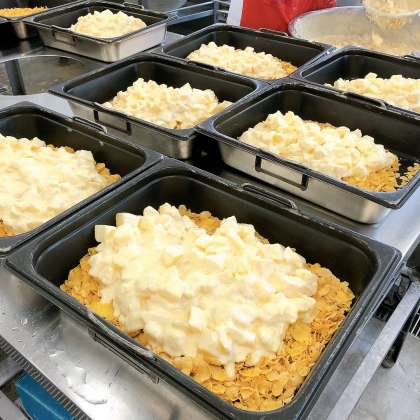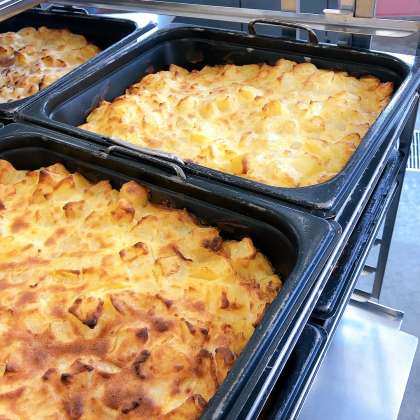 「クラフティ」はフランスの伝統的な焼き菓子です。卵・クリーム・さとう・小麦粉などでつくった生地にくだものを加えてオーブンでやいてつくります。今日はりんごをつかった「りんごのクラフティ」が登場しました。写真右は焼く前、写真左は焼いた後のクラフティです。