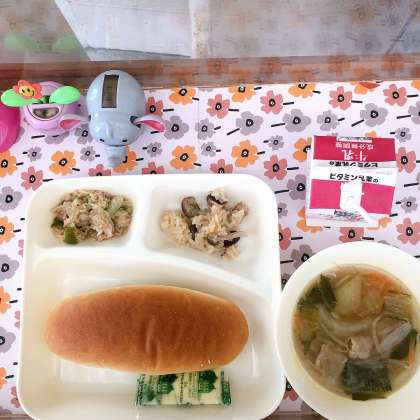 5/30の給食は「金時豆のちゅうかおこわ、ちゅうかスープ、ツナと野菜のオイスターソースいため、コッペパン、ソフトマーガリン、牛乳」でした。