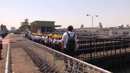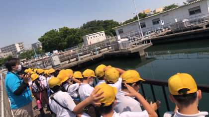 沈殿池を見ています。魚が泳いでいると、喜んでいます。