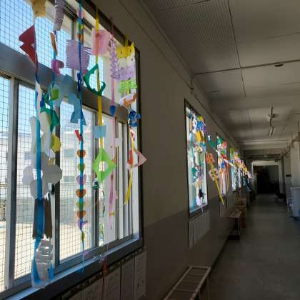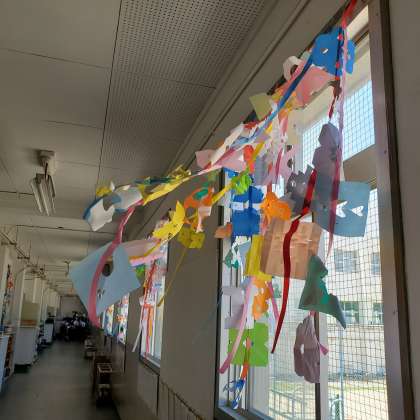 図工の飾りが風に揺れています