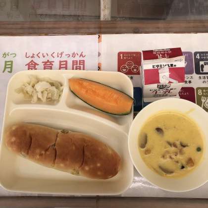 6/2の給食は「かぼちゃのクリームシチュー、キャベツのゆずドレッシング、クインシーメロン、おさつパン、牛乳」でした。