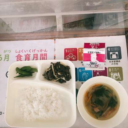 6/20の給食は「チンジャオニューロウスー、ハムと野菜の中華スープ、えだまめ、ごはん、牛乳」でした。
