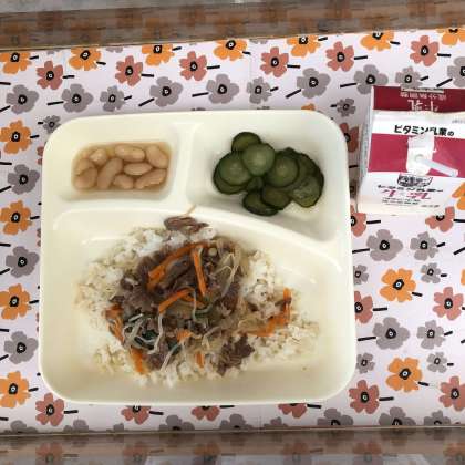 7/1の給食は「牛丼、きゅうりのしょうがづけ、大福豆のにもの、牛乳」でした。