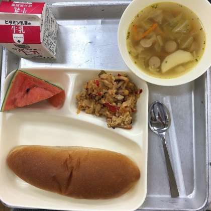 7/5の給食は「パエリア、ウインナーとキャベツのスープ、すいか、こくとうパン、牛乳」でした。