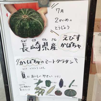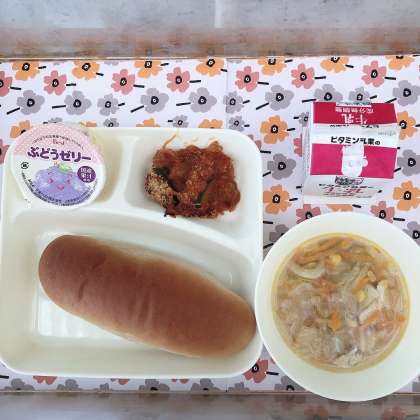 7/12の給食は「かぼちゃのミートグラタン、スープ、ぶどうゼリー、こくとうパン、牛乳」でした。
