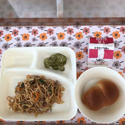 8/30の給食は「オイスターソースやきそば、きゅうりのピリからあえ、こくとうクレセントロールパン、牛乳」でした。