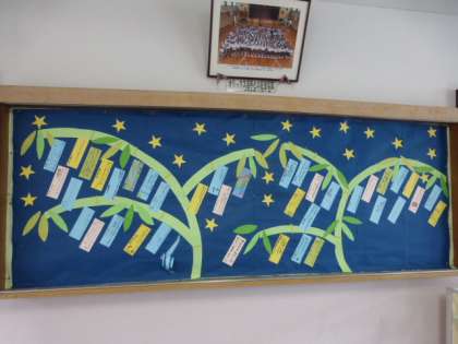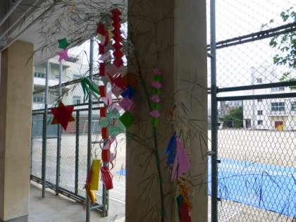7月6日(月)今日は、あいにくのお天気となりました。明日は七夕です。玄関や廊下に七夕の飾りを作って、飾っていました。