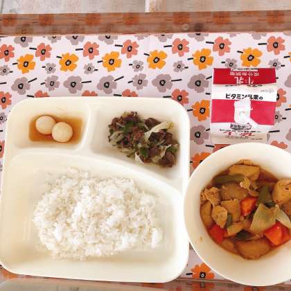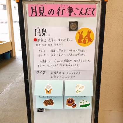 9/7の給食は『月見の行事こんだて』で「一口がんもとさといものみそに、牛肉と野菜のいためもの、みたらしだんご、ごはん、牛乳」でした。