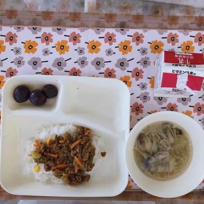 9/15の給食は、令和3年度学校給食献立コンクール優秀賞に選ばれた献立です。「野菜たっぷりカラフルライス、キャベツときのこのスープ、ぶどう(巨峰)、牛乳」でした。