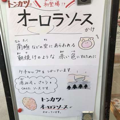 10/14の給食は「トンカツのオーロラソースかけ、スープ、あっさりキャベツ、おさつパン、牛乳」でした。