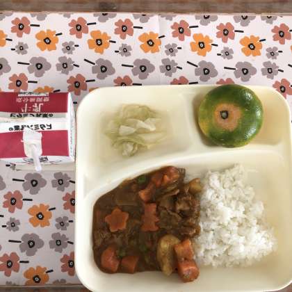 10/18の給食は「ポークカレーライス[米粉]、サワーキャベツ、みかん、牛乳」でした。