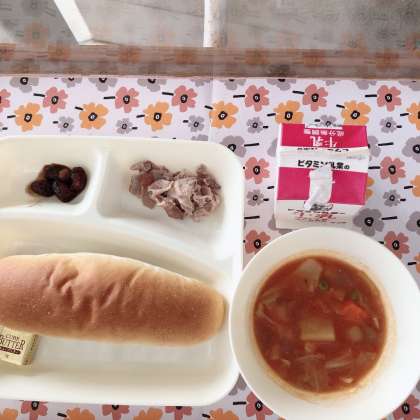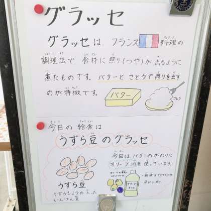 11/9の給食は「ぶた肉のガーリック焼き、ケチャップ煮、うずらまめのグラッセ、コッペパン、バター、牛乳」でした。