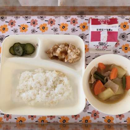 11/21の給食は「あげどりのねぎだれかけ、ぶた肉とじゃがいものにもの、きゅうりの赤じそあえ、ごはん、牛乳」でした。