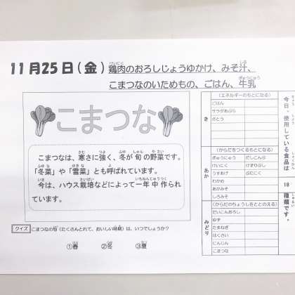 11/25の給食は「けい肉のおろしじょうゆかけ、みそしる、こまつなのいためもの、ごはん、牛乳」でした。