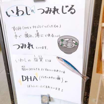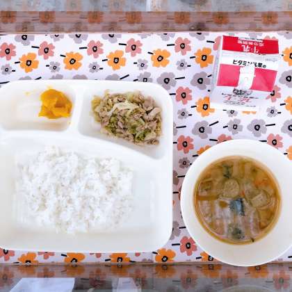 11/30の給食は「ぶた肉と野菜のいためもの、いわしのつみれじる、かぼちゃういろう、ごはん、牛乳」でした。