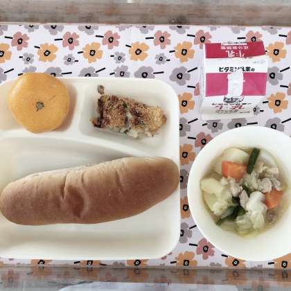 12/1の給食は「きのこのドリア、けい肉とじゃがいものスープに、みかん、こくとうパン、牛乳」でした。
