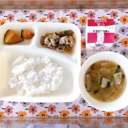 12/2の給食は「ぶた肉とほしずいきのみそに、うすくずじる、やきかぼちゃのあまみつかけ、ごはん、牛乳」でした。