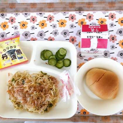 12/5の給食は「和風やきそば、きゅうりのしょうがづけ、いりくろまめ、こくとうクレセントロールパン、牛乳」でした。