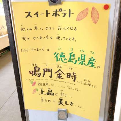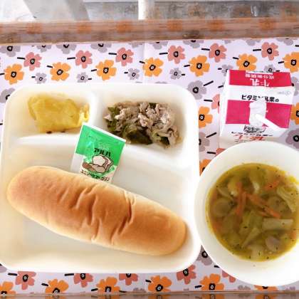 12/8の給食は「ぶた肉と野菜のソテー、スープ、スイートポテト、コッペパン、ソフトマーガリン、牛乳」でした。