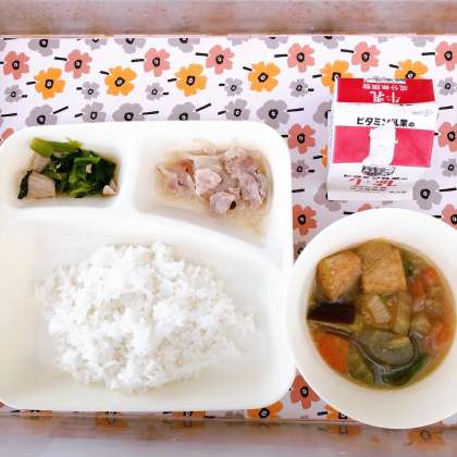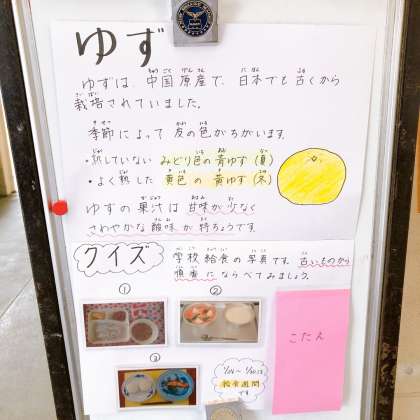 1/27の給食は「けい肉のゆず塩焼き、あつあげと野菜のにもの、小松菜のにびたし、ごはん、牛乳」でした。