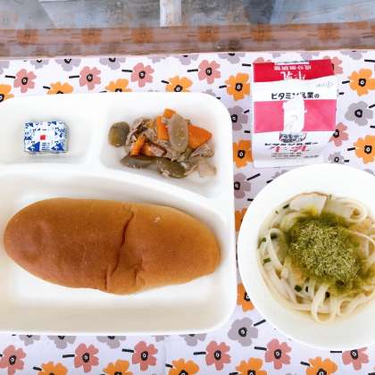2/2の給食は「ぶた肉とごぼうのにもの、なにわうどん、こけいチーズ、こくとうパン、牛乳」でした。