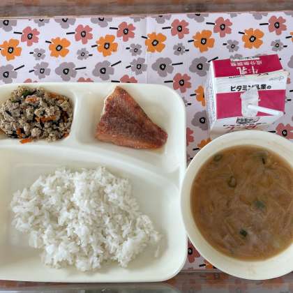 2/15の給食は「あかうおのレモンじょうゆかけ、みそしる、こうやどうふのいりに、ごはん、牛乳」でした。