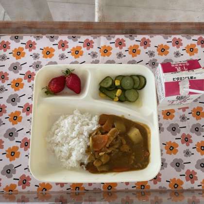 2/17の給食は「チキンレバーカレーライス、きゅうりとコーンのサラダ、いちご、牛乳」でした。