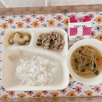 3/1の給食は「ぶた肉と野菜のいためもの、すましじる、きなこよもぎだんご、ごはん、牛乳」でした。