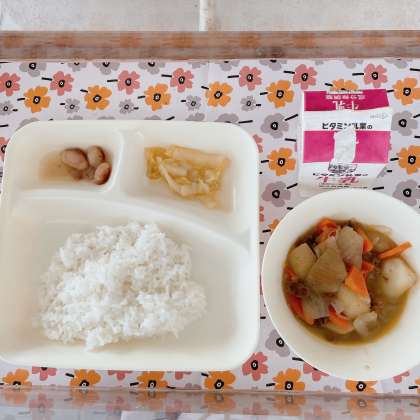 3/3の給食は「肉じゃが、白菜のゆず風味、とら豆の煮もの、ごはん、牛乳」でした。