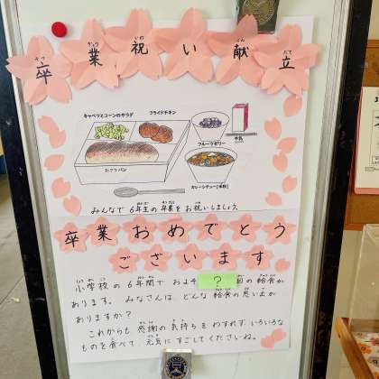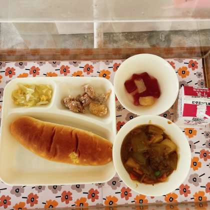 3/9の給食は『卒業祝いこんだて』で「フライドチキン、カレーシチュー(こめこ)、キャベツとコーンのサラダ、フルーツゼリー、おさつパン、牛乳」でした。