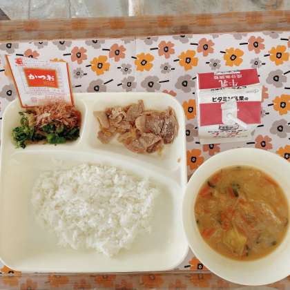 3/10の給食は「ぶた肉のしょうが焼き、さつまいものみそしる、なのはなのおひたし、ごはん、牛乳」でした。