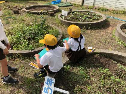 学習園に行くと、2年生が一生懸命にスケッチをしていました。最近は植物の観察はタブレットを使うことが多いので、スケッチをしているのは珍しい光景です。聞いてみると、図工の時間で春の植物をスケッチしているとのことでした。
