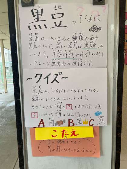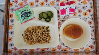 4/24の給食は「やきそば、きゅうりのしょうがづけ、ソフトくろまめ、こくとうクレセントロールパン」でした。