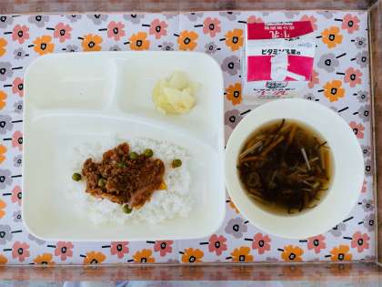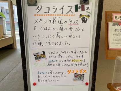 5/8の給食は「タコライス、もずくのスープ、焼きじゃが、ご飯、牛乳」でした。