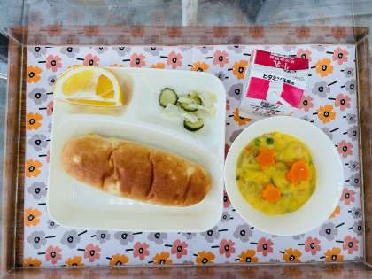 5/9の給食は「コーンクリームシチュー、キャベツときゅうりのサラダ、かわちばんかん、おさつパン、牛乳」でした。