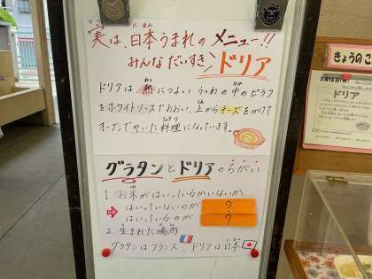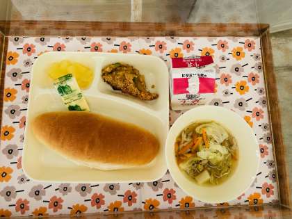 5/16の給食「カレードリア、ぶたにくとキャベツのスープ、りんご(カット缶)、コッペパン、ソフトマーガリン」でした。