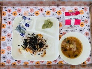 ?5/19の給食は「かやくごはん、みそ汁、まっちゃういろう、牛乳」でした。