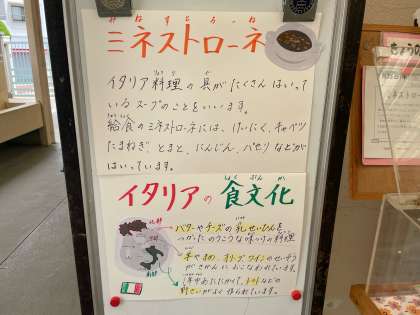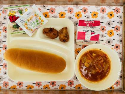 5/25の給食は「ひとくちトンカツ、ミネストローネ、まめこんぶ、コッペパン、アプリコットジャム、牛乳」でした。