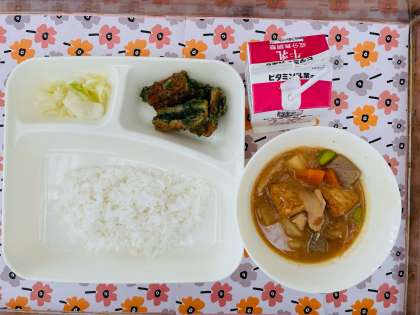 5/29の給食は「ちくわのいそべあげ、あつあげとさといものみそに、あっさりキャベツ、ごはん、牛乳」でした。